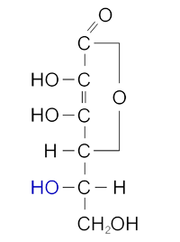 I właśnie literkę „L” wykorzystano do oszustwa marketingowego na wielką skalę. Witamina C „lewoskrętna” NIE ISTNIEJE!!! Wspomniana literka „L” oznacza tylko i wyłącznie, że grupa hydroksylowa (zaznaczona na niebiesko na poniższej rycinie) w tzw. projekcji Fishera znajduje się po lewej stronie cząsteczki kwasu askorbinowego.